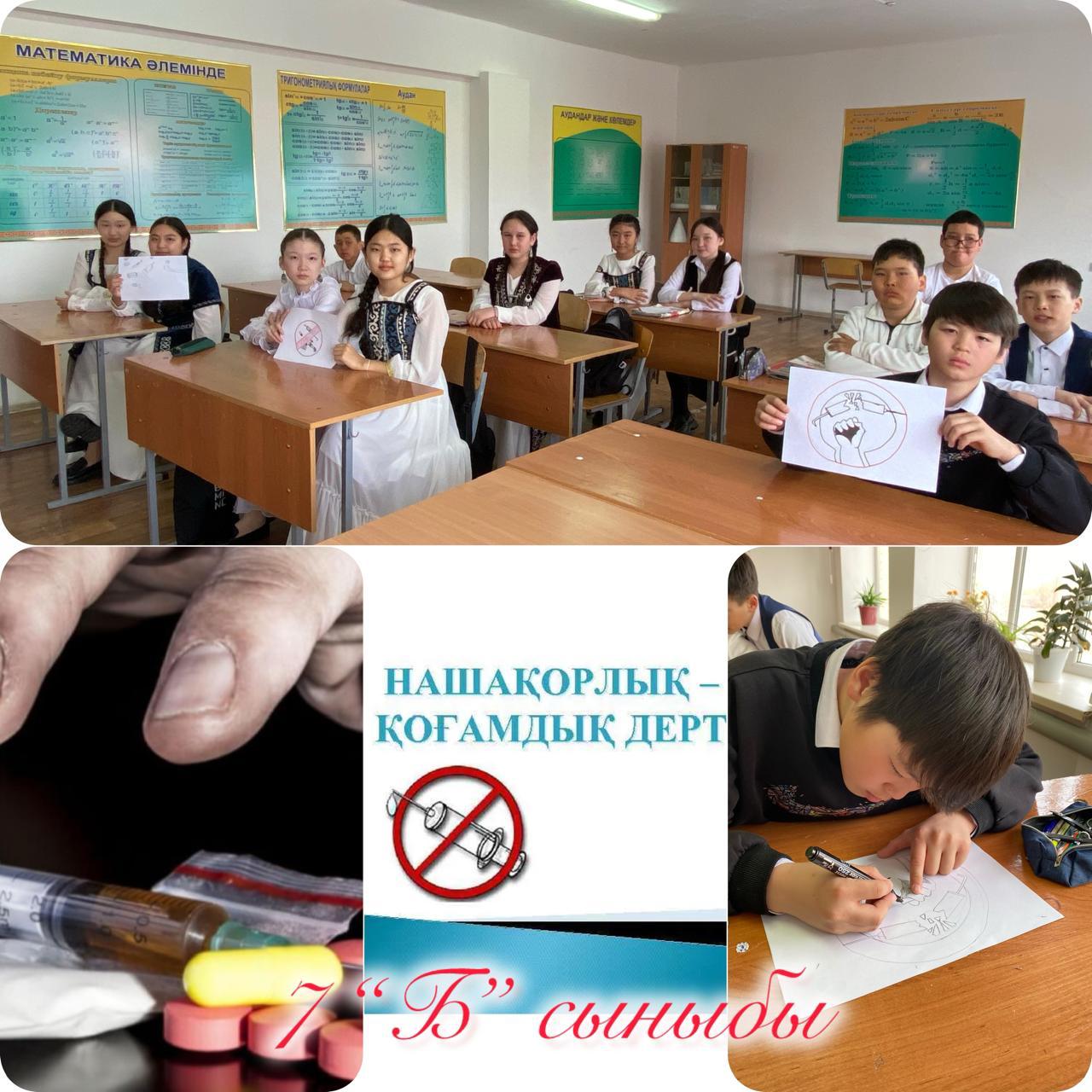 17.03.2025 ж. Оқушыларға «Нашақорлық қоғам дерті», «Ертеңіңді ойласаң есірткіге жолама!» тақырыптарында тәрбие сағаты өткізілді. Мақсаты: психикаға белсенді әсер ететін зиянды заттар туралы ақпарат беру, олардың адам ағзасына кері әсерін түсіндіру арқылы салауатты өмір салтын ұстануға шақыру. Сабақ барысында оқушыларға «темекі шегетін қоспалар» мен «синтетикалық есірткілерді» тұтынудың ауыр салдары, лудомания, нашақорлықтың алдын алу, интернетке тәуелділік бағытында ақпараттық-танымдық біліммен қамтамасыз ету шаралары қамтылды. Адамзаттың басты мәселесі – психологиялық тәуелділік, есірткіні тұтыну себептері мен зардаптары туралы толық түсіндірме жасалды. Білім алушылар